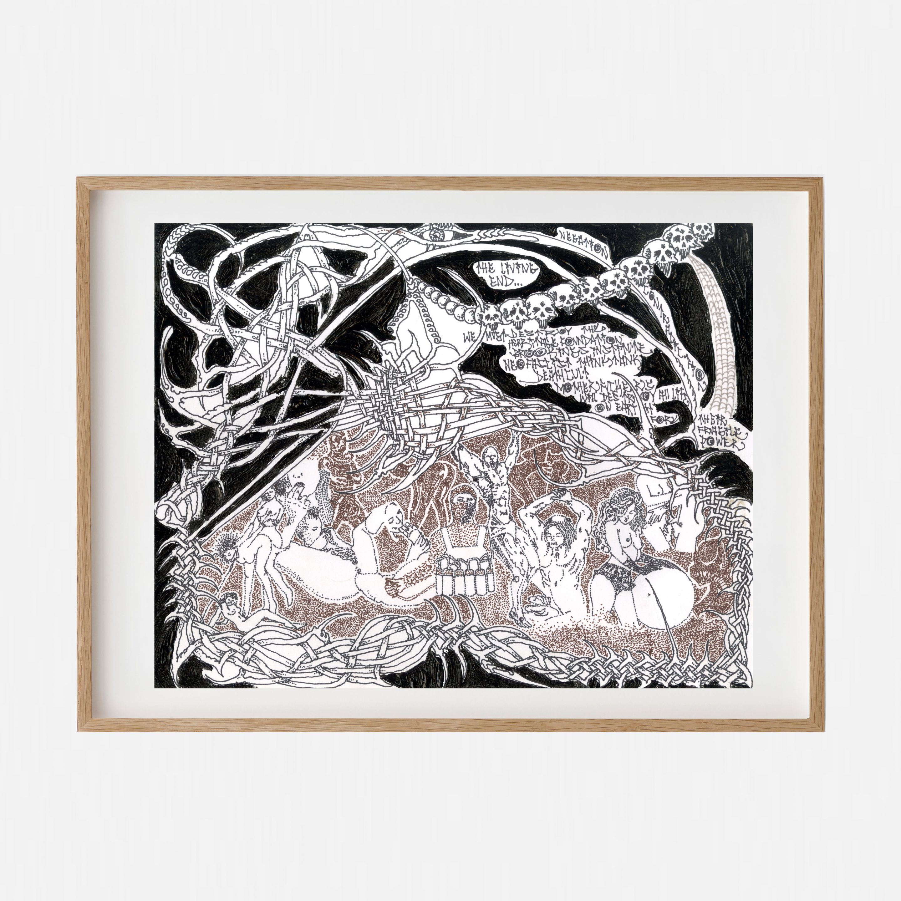 Death and despair are constant themes in Wombat’s work. Skulls, gas masks, smoke stacks, love making and drug taking. Celtic knots known for the representation of an endless cycle of life, death, and rebirth frame the chaos in a connective tissue that spans throughout all of Wombat’s work. Another reoccurring symbol is the ever-present White Dove, a messenger of hope and peace. Perhaps unexpected but greatly needed. In these turbulent times hope can feel like a luxury, but without it all is lost. Hope can produce and contribute and connect with others. Hope can make survival in an unfair world seem like a worthy pursuit. Hope and negativity go hand in hand: black, white and various shades of grey.